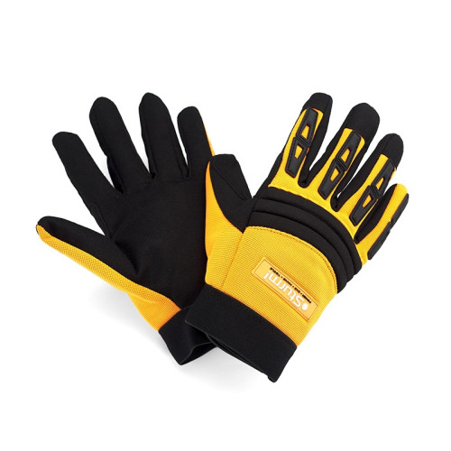 Верх перчаток выполнен из эластичного материала, который препятствует промоканию и легко чистится. Внутренняя часть изделия сшита из “дышащей” ткани – износостойкого воздухопроницаемого синтетического материала на основе текстильного микроволокна – благодаря чему обеспечиваются мягкость и комфорт при использовании перчаток. На пальцах с тыльной стороны нашиты специальные твердые накладки, которые дают высокую степень защиты в тяжелых условиях работы.
