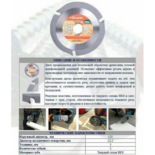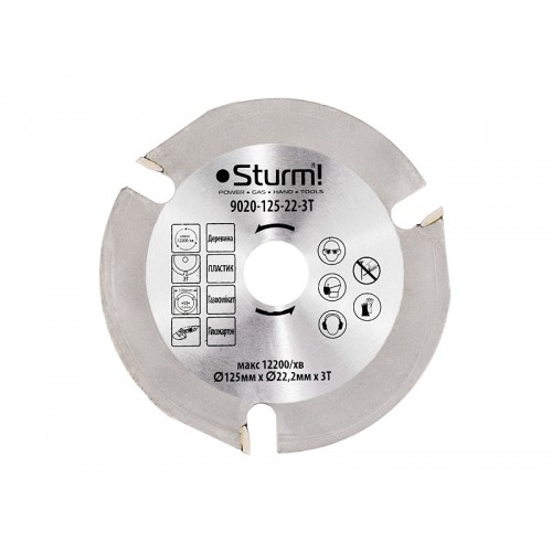 Трехзубый пильный диск Sturm 9020-125-22-3T - специальная разработка для безопасной работы по дереву угловой шлифовальной машиной. Позволяет эффективно резать дерево и производные материалы, выбирать пазы при боковом движении. Рез получается плавный, рывки и удары при врезании отсутствуют - что и определяет его безопасность. Конструкция с тремя зубьями позволяет ограничить подачу при врезании и устранить удары. Кроме того, диск отлично работает и по пенобетону.