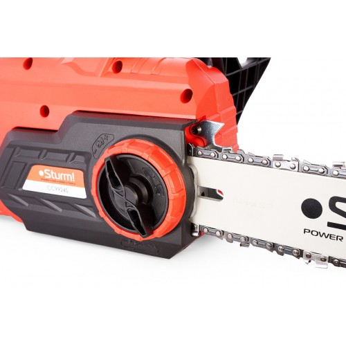 Пила цепная электрическая Sturm CC9924S - инструмент, применяемый в домашнем хозяйстве для пиления дров, валки небольших деревьев и при возведении деревянных сооружений. Пила укомплектована электродвигателем мощностью 2400 Вт, шиной длиной 405 мм. Число звеньев вцепи 57, шаг цепи 3/8. Смазка цепи происходит автоматически, для этого необходимо только время от времени проверять уровень масла в масляном баке. Натяжение цепи производится при помощи безключевой системы на корпусе. Инструмент имеет компактные размеры за счет поперечного расположения электродвигателя и встроенного редуктора. Пила очень удобна в работе и имеет хороший запас мощности, что позволяет производить распил бысто и на протяжении большого колличества времени. Также данная модель очень удобна и эргономична, что не заставит вас чувствовать дискомфорт при работе.