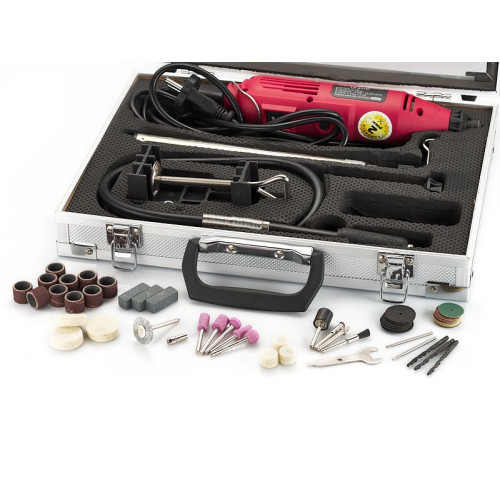 Комплектация | гибкий вал – 1 шт; штатив – 1 шт; патронный ключ – 1 шт; насадки – 65 шт; кейс – 1 шт |