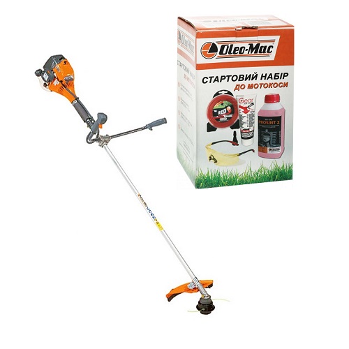 • укомплектована стартовым набором в который входит: 2-х тактное масло для двигателя"Oleo-Mac" - 0,5 л., масло для редуктора "OREGON" - 125 г.,  леска для кошения "OREGON" - 15 м; защитные очки "OREGON".