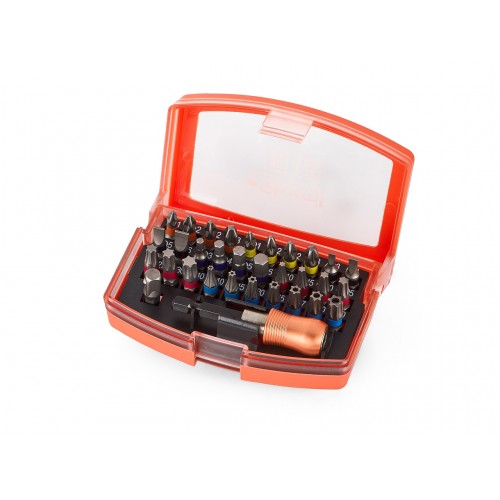 Комплектация - | 30 шт бит 25 мм: PH1, PH2x2, PH3, PZ1, PZ2x2, PZ3, SL3, SL4, SL5, SL6, H3, H4, H5, H6, TX10, TX15, TX20, TX25, TX27, TX30, TX40, TT10, TT15, TT20, TT25, TT27, TT30, TT40, быстросъемный держатель для бит, адаптер 1/4. |