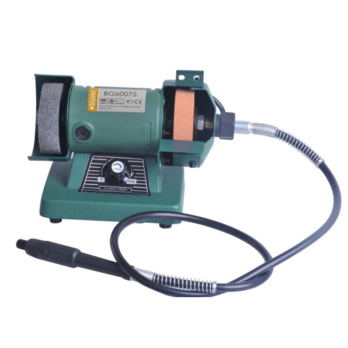 Точило + гравер 2в1 Sturm BG60075 – инструмент бытового класса. Включает в себя шлифовальное колесо, полировочное колесо и гравер. Применяется для подравнивания, резки, шлифовки и полировки изделий из камня, металла, стекла, дерева, мрамора и других материалов. Предназначен для сухой заточки. Оснащен электродвигателем с входной мощностью 140 Вт, скорость оборотов регулируется при помощи рычага в пределах 0-9900 об/мин. В комплект поставки включен гибкий вал гравера с двумя цангами.