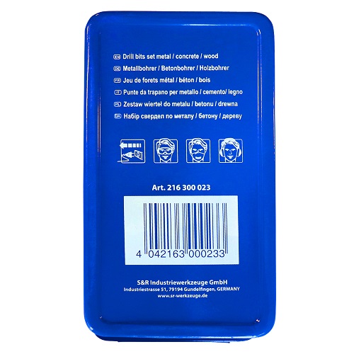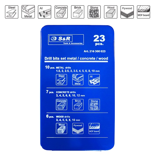 S&R 23 шт. - комбинированный набор сверл, который входит 6 сверл по дереву, 10 сверл по металлу, 7 сверл по бетону. Таким образом покупая один набор сверл, Вы получаете универсальный инструмент для работы с разным типом материала: бетон, металл, дерево, пластик и пр.