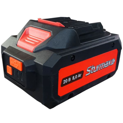 Sturmax CRM2008B – акумуляторна батарея збільшеної ємності лінійки інструменту Sturmax Cordless Range. Напруга – 20 В. Ємність – 8 А·год. Оснащена фірмовими елементами SunPower, які забезпечують високу надійність і тривалий термін служби, а також системою захисту від перезарядження і перерозрядження. Передбачено індикатор рівня заряду, що дозволяє візуально контролювати залишковий заряд батареї, а також USB-порт для підзарядки мобільних пристроїв і гаджетів.