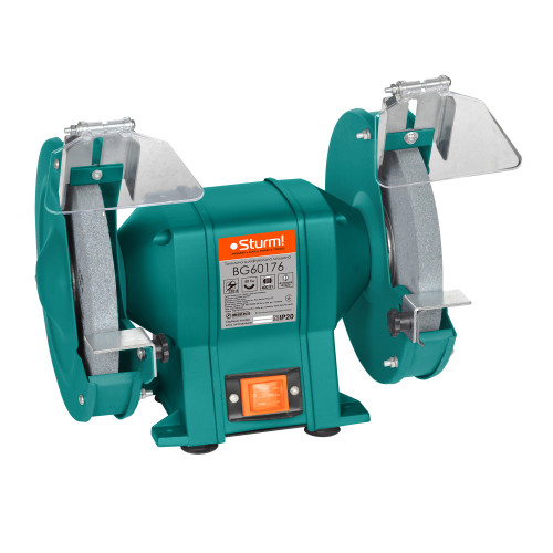 Sturm BG60176 (новинка 2023 года!) – мощный универсальный точильно-шлифовальный станок бытового назначения. Инструмент предназначен для широкого спектра работ: заточки, шлифовки, снятия ржавчины, придания деталям необходимой формы и т д. Благодаря солидной массе и широкой опорной платформе с резиновыми ножками модель очень устойчива и позволяет ее использование без принудительной фиксации к верстаку. Однако, при необходимости устройство можно закрепить стационарно – для этого на основании выполнены специальные крепежные отверстия. Станок оснащен надежным 400 Вт асинхронным двигателем и имеет низкие показатели по шуму, вибрации и нагреву. Комплектуется двумя абразивными кругами из серого электрокорунда диаметром 175 мм и толщиной 20 мм, с разным типом зернистости, что позволяет эффективно использовать инструмент, как для черновых обдирочных (грубая заточка, обработка материалов повышенной прочности), так и для более ответственных операций (чистовая заточка). Для большего удобства пользователя конструкцией предусмотрена возможность безинструментальной (с помощью барашковых гаек) регулировки рабочих упоров – это позволяет при необходимости быстро и легко установить упор для затачиваемого изделия под нужным углом. Прочные откидные экраны из поликарбоната надежно защищают оператора от искр и металлической стружки, позволяя контролировать рабочий процесс, без риска получения случайных травм.