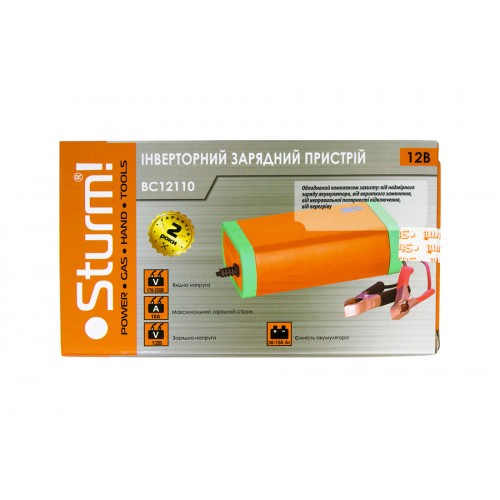 Инверторное зарядное устройство Sturm BC12105 служит для заряда в автоматическом режиме стартерных 12 В батарей, обслуживаемых и необслуживаемых, ёмкостью от 38 до 150 Ач, а также для десульфатизации засульфатированных АКБ, для длительного поддержания АКБ в заряженном состоянии, для предохранения их от перезаряда и сульфатации. Способно заряжать АКБ, разряженные пректически до 0, реанимируя их короткими импульсами с высокой частотой и силой тока до 10А. Имеет защиту от перенапряжений и коротких замыканий, отключение АКБ от цепей заряда. От обратной полярности защищено предохранителем. Конструктивно устройство выполнено в пластмассовом корпусе, имеющем жалюзи для вентиляции. На задней панели расположены предохранитель, сетевой шнур и провода с клеммами.
